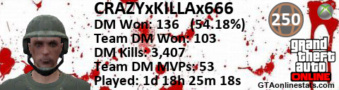 [URL=http://GTAonlinestats.com/showplayer/CRAZYxKILLAx666][IMG]http://GTAonlinestats.com/dmsignature/CRAZYxKILLAx666/sig.png[/IMG][/URL]