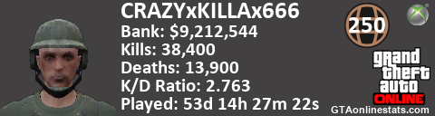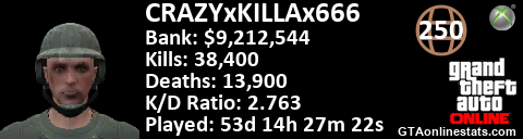 [URL=http://GTAonlinestats.com/showplayer/CRAZYxKILLAx666][IMG]http://GTAonlinestats.com/greysignature/CRAZYxKILLAx666/sig.png[/IMG][/URL]