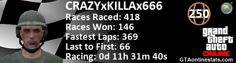 [URL=http://GTAonlinestats.com/showplayer/CRAZYxKILLAx666][IMG]http://GTAonlinestats.com/racesignature/CRAZYxKILLAx666/sig.png[/IMG][/URL]