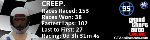 <a href="http://GTAonlinestats.com/showplayer/CREEP."><img src="http://GTAonlinestats.com/racesignature/CREEP./sig.png" alt="CREEP." border="0" /></a>