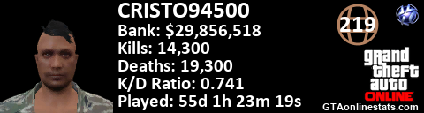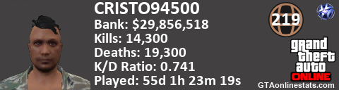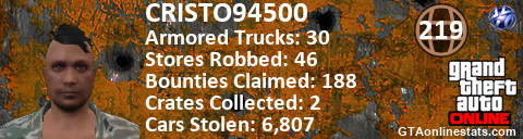 [URL=http://GTAonlinestats.com/showplayer/CRISTO94500][IMG]http://GTAonlinestats.com/crimesignature/CRISTO94500/sig.png[/IMG][/URL]
