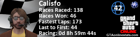[URL=http://GTAonlinestats.com/showplayer/Calisfo/2][IMG]http://GTAonlinestats.com/racesignature/Calisfo/2/sig.png[/IMG][/URL]