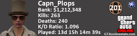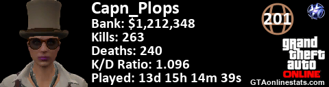 [URL=http://GTAonlinestats.com/showplayer/Capn_Plops/2][IMG]http://GTAonlinestats.com/signature/Capn_Plops/2/sig.png[/IMG][/URL]