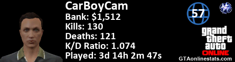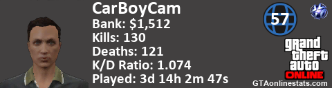 <a href="http://GTAonlinestats.com/showplayer/CarBoyCam"><img src="http://GTAonlinestats.com/dmsignature/CarBoyCam/sig.png" alt="CarBoyCam" border="0" /></a>