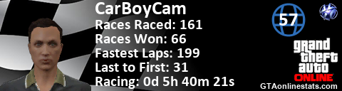 [URL=http://GTAonlinestats.com/showplayer/CarBoyCam][IMG]http://GTAonlinestats.com/racesignature/CarBoyCam/sig.png[/IMG][/URL]