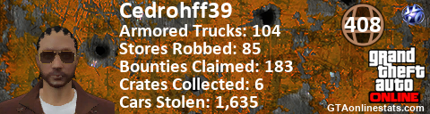 [URL=http://GTAonlinestats.com/showplayer/Cedrohff39][IMG]http://GTAonlinestats.com/crimesignature/Cedrohff39/sig.png[/IMG][/URL]