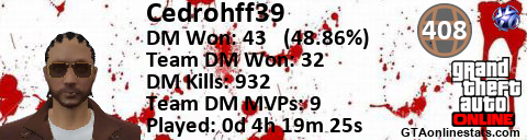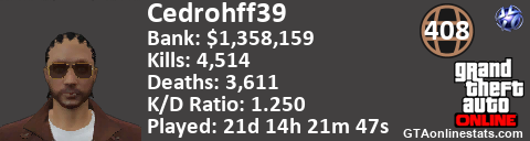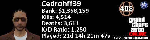 <a href="http://GTAonlinestats.com/showplayer/Cedrohff39"><img src="http://GTAonlinestats.com/dmsignature/Cedrohff39/sig.png" alt="Cedrohff39" border="0" /></a>