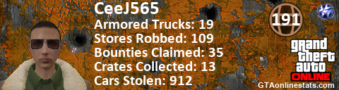 [URL=http://GTAonlinestats.com/showplayer/CeeJ565][IMG]http://GTAonlinestats.com/crimesignature/CeeJ565/sig.png[/IMG][/URL]