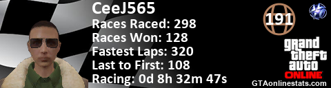 [URL=http://GTAonlinestats.com/showplayer/CeeJ565][IMG]http://GTAonlinestats.com/racesignature/CeeJ565/sig.png[/IMG][/URL]