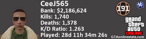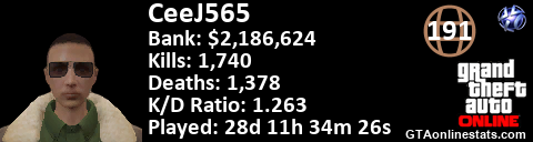 [URL=http://GTAonlinestats.com/showplayer/CeeJ565][IMG]http://GTAonlinestats.com/signature/CeeJ565/sig.png[/IMG][/URL]