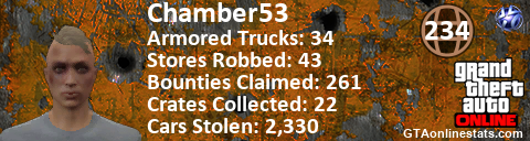 <a href="http://GTAonlinestats.com/showplayer/Chamber53"><img src="http://GTAonlinestats.com/randomsignature/Chamber53/sig.png" alt="Chamber53" border="0" /></a>