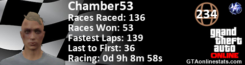 [URL=http://GTAonlinestats.com/showplayer/Chamber53][IMG]http://GTAonlinestats.com/racesignature/Chamber53/sig.png[/IMG][/URL]