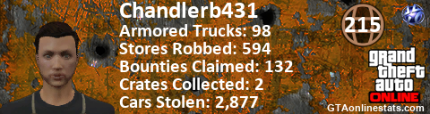 [URL=http://GTAonlinestats.com/showplayer/Chandlerb431][IMG]http://GTAonlinestats.com/crimesignature/Chandlerb431/sig.png[/IMG][/URL]