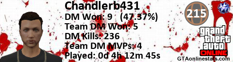 [URL=http://GTAonlinestats.com/showplayer/Chandlerb431][IMG]http://GTAonlinestats.com/dmsignature/Chandlerb431/sig.png[/IMG][/URL]
