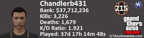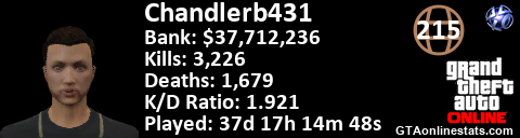 [URL=http://GTAonlinestats.com/showplayer/Chandlerb431][IMG]http://GTAonlinestats.com/signature/Chandlerb431/sig.png[/IMG][/URL]