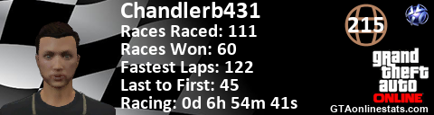 [URL=http://GTAonlinestats.com/showplayer/Chandlerb431][IMG]http://GTAonlinestats.com/racesignature/Chandlerb431/sig.png[/IMG][/URL]