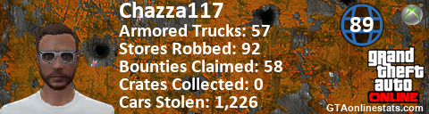 [URL=http://GTAonlinestats.com/showplayer/Chazza117][IMG]http://GTAonlinestats.com/signature/Chazza117/sig.png[/IMG][/URL]