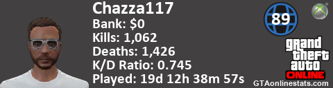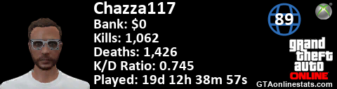 <a href="http://GTAonlinestats.com/showplayer/Chazza117"><img src="http://GTAonlinestats.com/dmsignature/Chazza117/sig.png" alt="Chazza117" border="0" /></a>
