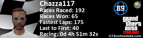 [URL=http://GTAonlinestats.com/showplayer/Chazza117][IMG]http://GTAonlinestats.com/racesignature/Chazza117/sig.png[/IMG][/URL]