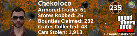 [URL=http://GTAonlinestats.com/showplayer/Chekoloco][IMG]http://GTAonlinestats.com/randomsignature/Chekoloco/sig.png[/IMG][/URL]