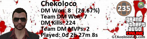 [URL=http://GTAonlinestats.com/showplayer/Chekoloco][IMG]http://GTAonlinestats.com/dmsignature/Chekoloco/sig.png[/IMG][/URL]