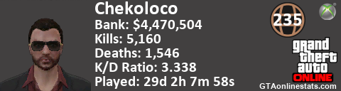 [URL=http://GTAonlinestats.com/showplayer/Chekoloco][IMG]http://GTAonlinestats.com/signature/Chekoloco/sig.png[/IMG][/URL]