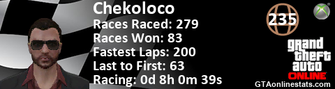 [URL=http://GTAonlinestats.com/showplayer/Chekoloco][IMG]http://GTAonlinestats.com/racesignature/Chekoloco/sig.png[/IMG][/URL]
