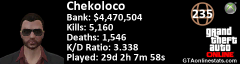 <a href="http://GTAonlinestats.com/showplayer/Chekoloco"><img src="http://GTAonlinestats.com/signature/Chekoloco/sig.png" alt="Chekoloco" border="0" /></a>