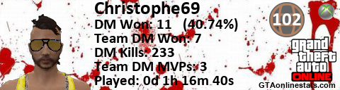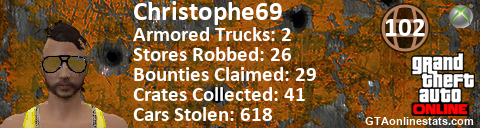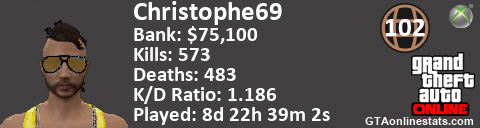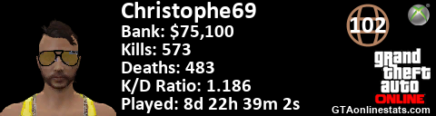 <a href="http://GTAonlinestats.com/showplayer/Christophe69"><img src="http://GTAonlinestats.com/dmsignature/Christophe69/sig.png" alt="Christophe69" border="0" /></a>