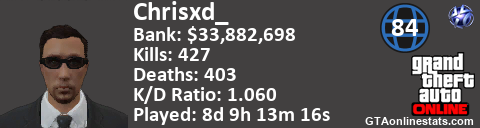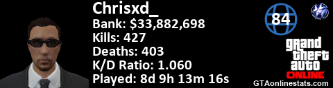 <a href="http://GTAonlinestats.com/showplayer/Chrisxd_"><img src="http://GTAonlinestats.com/dmsignature/Chrisxd_/sig.png" alt="ChrisXD_" border="0" /></a>