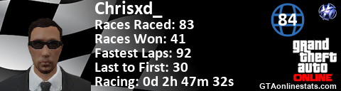 <a href="http://GTAonlinestats.com/showplayer/Chrisxd_"><img src="http://GTAonlinestats.com/racesignature/Chrisxd_/sig.png" alt="ChrisXD_" border="0" /></a>