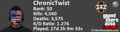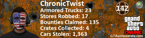 [URL=http://GTAonlinestats.com/showplayer/ChronicTwist/2][IMG]http://GTAonlinestats.com/signature/ChronicTwist/2/sig.png[/IMG][/URL]