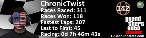 <a href="http://GTAonlinestats.com/showplayer/ChronicTwist/2"><img src="http://GTAonlinestats.com/racesignature/ChronicTwist/2/sig.png" alt="ChronicTwist" border="0" /></a>