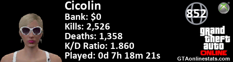 [URL=http://GTAonlinestats.com/showplayer/Cicolin/2][IMG]http://GTAonlinestats.com/signature/Cicolin/2/sig.png[/IMG][/URL]