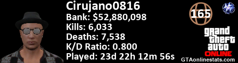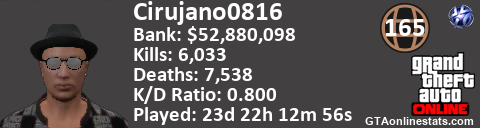 [URL=http://GTAonlinestats.com/showplayer/Cirujano0816][IMG]http://GTAonlinestats.com/signature/Cirujano0816/sig.png[/IMG][/URL]