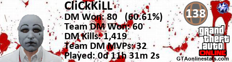 [URL=http://GTAonlinestats.com/showplayer/CliCkKiLL/2][IMG]http://GTAonlinestats.com/dmsignature/CliCkKiLL/2/sig.png[/IMG][/URL]