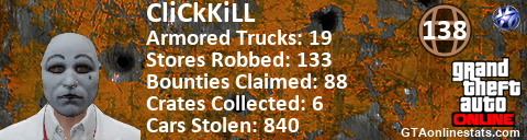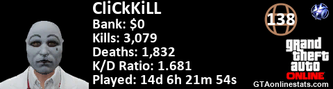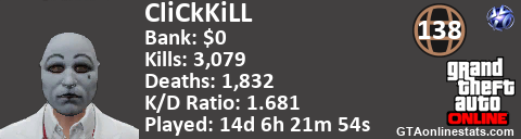[URL=http://GTAonlinestats.com/showplayer/CliCkKiLL/2][IMG]http://GTAonlinestats.com/signature/CliCkKiLL/2/sig.png[/IMG][/URL]