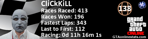 [URL=http://GTAonlinestats.com/showplayer/CliCkKiLL/2][IMG]http://GTAonlinestats.com/racesignature/CliCkKiLL/2/sig.png[/IMG][/URL]