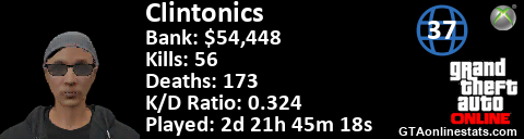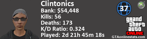 [URL=http://GTAonlinestats.com/showplayer/Clintonics][IMG]http://GTAonlinestats.com/dmsignature/Clintonics/sig.png[/IMG][/URL]
