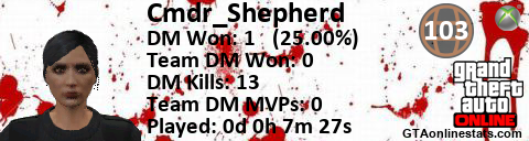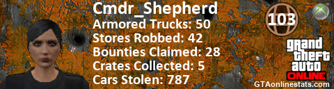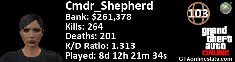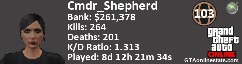 [URL=http://GTAonlinestats.com/showplayer/Cmdr_Shepherd/2][IMG]http://GTAonlinestats.com/randomsignature/Cmdr_Shepherd/2/sig.png[/IMG][/URL]