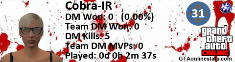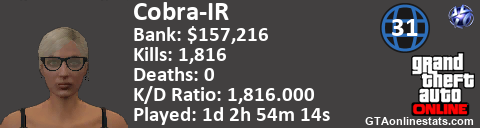 <a href="http://GTAonlinestats.com/showplayer/Cobra-IR"><img src="http://GTAonlinestats.com/dmsignature/Cobra-IR/sig.png" alt="Cobra-IR" border="0" /></a>