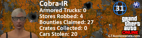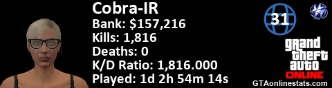 <a href="http://GTAonlinestats.com/showplayer/Cobra-IR"><img src="http://GTAonlinestats.com/randomsignature/Cobra-IR/sig.png" alt="Cobra-IR" border="0" /></a>