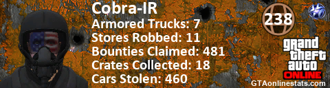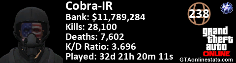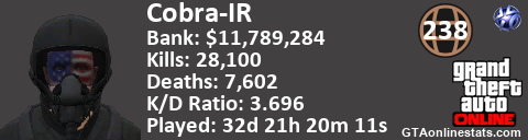<a href="http://GTAonlinestats.com/showplayer/Cobra-IR/2"><img src="http://GTAonlinestats.com/signature/Cobra-IR/2/sig.png" alt="Cobra-IR" border="0" /></a>