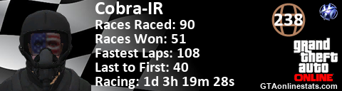 [URL=http://GTAonlinestats.com/showplayer/Cobra-IR/2][IMG]http://GTAonlinestats.com/racesignature/Cobra-IR/2/sig.png[/IMG][/URL]