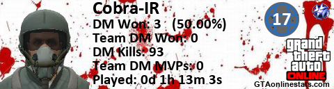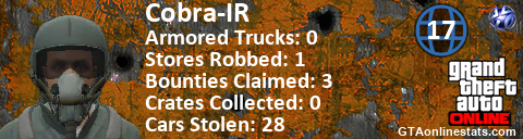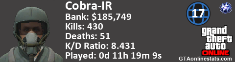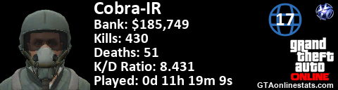 <a href="http://GTAonlinestats.com/showplayer/Cobra-IR/3"><img src="http://GTAonlinestats.com/signature/Cobra-IR/3/sig.png" alt="Cobra-IR" border="0" /></a>