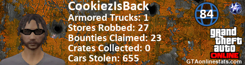 [URL=http://GTAonlinestats.com/showplayer/CookiezIsBack][IMG]http://GTAonlinestats.com/crimesignature/CookiezIsBack/sig.png[/IMG][/URL]
