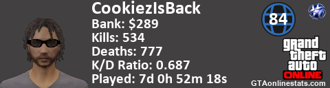 <a href="http://GTAonlinestats.com/showplayer/CookiezIsBack"><img src="http://GTAonlinestats.com/signature/CookiezIsBack/sig.png" alt="CookiezIsBack" border="0" /></a>