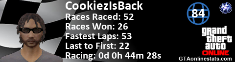 [URL=http://GTAonlinestats.com/showplayer/CookiezIsBack][IMG]http://GTAonlinestats.com/racesignature/CookiezIsBack/sig.png[/IMG][/URL]