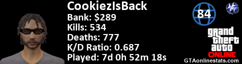 [URL=http://GTAonlinestats.com/showplayer/CookiezIsBack][IMG]http://GTAonlinestats.com/signature/CookiezIsBack/sig.png[/IMG][/URL]