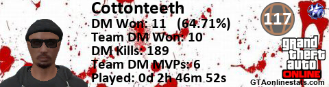 [URL=http://GTAonlinestats.com/showplayer/Cottonteeth][IMG]http://GTAonlinestats.com/dmsignature/Cottonteeth/sig.png[/IMG][/URL]